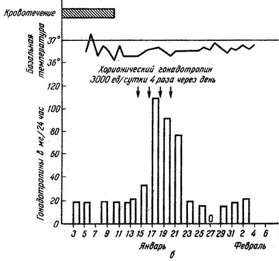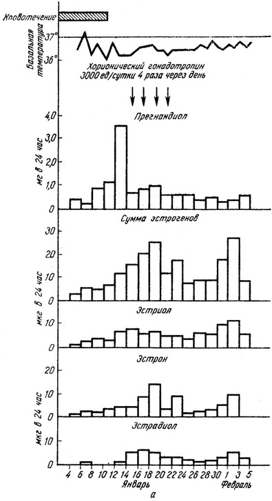За даними Brown і співавторів (1958), Brown (1959), період від овуляційного піку естрогенів до початку менструації при нормальному менструальному циклі зазвичай становить 11 -16 днів. У обстеженої нами хворий наступне кровотеча почалася тільки 3/IV 1968 р., тобто через 2,5 місяці після лікування хоріонічним гонадотропіном. Так як кількість виділених гонадотропінів до введення хоріонічного гонадотропіну було досить великим і під впливом екзогенного введення даного препарату система гіпоталамус - гіпофіз відповіла високою продукцією гонадотропінів, можна пояснити відсутність овуляції або лютеинизации нелопнувшего фолікула первинним порушенням їх реактивності до гонадотропної стимуляції.