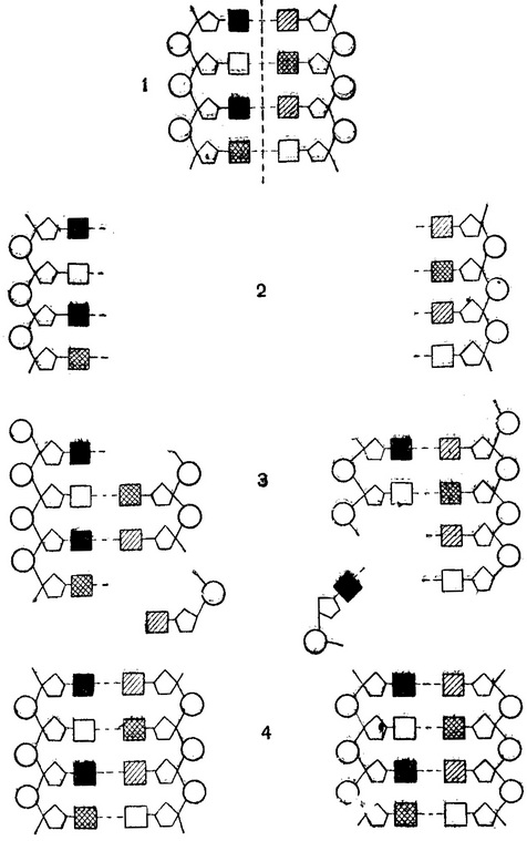 1 - подвійна ланцюжок ДНК; 2 - розщеплення ланцюга на дві частини; 3 - синтез нових ланцюгів; 4 - утворення двох молекул ДНК