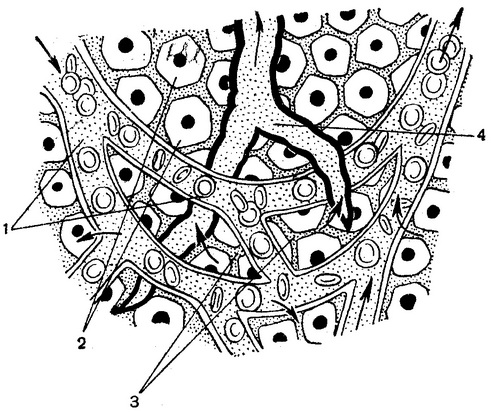 Рис. 20. Схема утворення тканинної рідини (малюнок на дошці): 1 - кровоносні капіляри, 2 - клітини; 3 - міжклітинний простір; 4 - лімфатичний капіляр