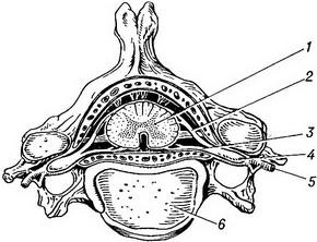 ![]() Рис. 2. Розташування спинного мозку в хребетному каналі (поперечний розріз) і вихід корінців спинномозкових нервів: 1 - спинний мозок; 2 - задній корінець; 3 - передній корінець; 4 - спинномозковий вузол; 5-спинномозковий нерв; 6 - тіло хребця. |