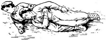Завали і руйнування зажадають вміння витягати постраждалого волоком. Його можна відтягати на боці, як це показано на рис. 27.