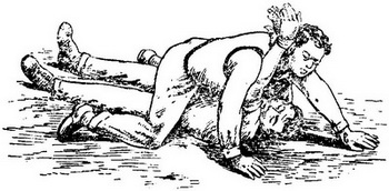Дуже зручний спосіб, при якому потерпілого кладуть на спину, його руки біля кистей пов'язують. Надає допомогу стає на коліна, розставивши ноги над тулубом потерпілого, а його зв'язані руки кладе собі на шию. Спираючись на руки, надає допомогу піднімає і поступово відтягає потерпілого, як це показано на рис. 28.