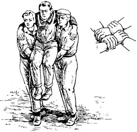 При можливості рухатися в зростання найлегше нести потерпілого з допомогою носилочной лямки або з'єднаних разом двох поясних ременів, складених вісімкою або кільцем, як це показано на рис. 29 і 30. На велику відстань найзручніше нести потерпілого на плечі (рис. 31), якщо немає лямки або ременів. Значно легше нести потерпілого удвох. Дуже поширений спосіб виносу удвох з допомогою «замку» з рук (рис. 32).