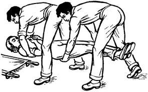 Для укладання потерпілого на ноші використовують в основному два прийоми. З чотирьох рятують троє стають на коліно обличчям до лежачого потерпілого і, підводячи під нього руки, одночасно піднімають його і кладуть на ті носилки, що підводить під потерпілого четвертий. Двоє рятують можуть застосувати спосіб маловідомий, але, як це видно з рис. 36, легкий і зручний.