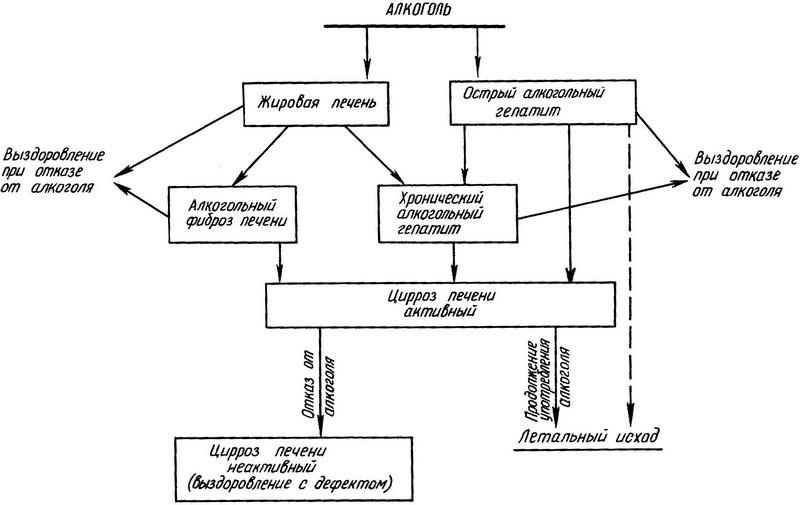 Алкогольне ураження печінки - порівняно тривалий, багатоетапний процес (рис. 18). У більшості хворих безперервне введення великих доз алкоголю супроводжується поступовим наростанням тяжкості змін у печінці. Від початкових обмінних зрушень, зазвичай не викликають істотного погіршення самопочуття, до важкої інвалідності, пов'язаної з перебудовою структури печінки та загибеллю значної частини її паренхіми, зазвичай проходить 2-3 десятиліття.