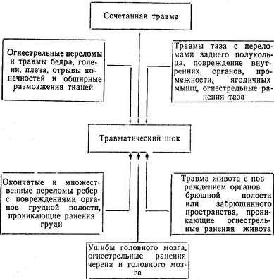 Із сказаного видно, що у всіх випадках поєднаних травм хоча б одна за своїм характером була «шокогенной». Причому ймовірність розвитку шоку при цьому посилювалася травматизацією інших анатомічних областей. У ряді випадків у одного і того ж потерпілого реєструвалися 2-3 «шокогенні» травми і більше, а іноді кожна травма окремо могла бути «нешокогенной», але у своєму сумарному впливі на організм вони приводили до виникнення травматичного шоку.