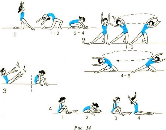 1. І.п. стоячи на коліні, права нога витягнута вперед, руки вгору. Повільно прогнутися назад як можна нижче. Таз вивести вперед так, щоб зігнути праву ногу в коліні, повільно сісти на ліву п'яту, розслаблено нахилитися, руками тягнутися до носку правої ноги, торкнувшись носка руками, нахилити голову вперед. Зробити 4 рази, починаючи з правої ноги, і 4 рази - з лівої. Повторити 3 рази.