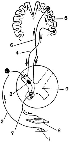 1 - рецептори; 2 - доцентровий нейрон; 3 - проміжний нейрон спинного мозку; 4 - шлях нервового збудження по спинному мозку в головний мозок; 5 - шлях нервового збудження у великих півкулях мозку; 6 - шлях нервового збудження від кори головного мозку до рухових нейронів спинного мозку; 7 - відцентровий нейрон; 8 - м'яз.