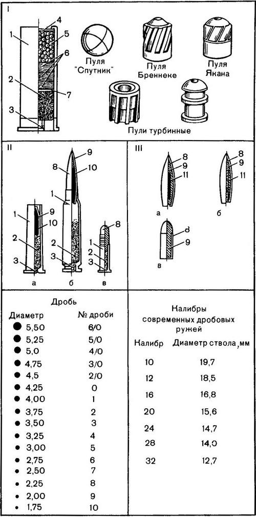 У спортивному зброю застосовують в більшості випадків кулі безоболочечные, тобто виготовлені цілком з свинцю. Для стрільби з промислового (мисливської) нарізної зброї використовують зазвичай кулі полуоболочечные. У таких куль задня і бічні поверхні мають оболонку у вигляді стаканчика, виготовленого з більш твердого металу (мельхіор, томпак). Передній кінець кулі (оживальная частина) при попаданні в ціль легко деформується, а іноді розпадається на частини, що посилює тяжкість поранення. Снарядом для нарізної зброї служить куля (може бути спеціальної конструкції). Оболонка кулі служить для додання їй більшої жорсткості при попаданні в ціль. Патрони для бойової зброї забезпечуються тільки оболонкових кулями. Кулі від патронів для бойової зброї можуть мати спеціальне призначення: бронебійні, запальні, трасуючі, бронебійно-запальні та ін. У відповідності з призначенням змінюється і внутрішня конструкція кулі: крім свинцевої частини, вона може містити сталевий сердечник (для бронебійних), світиться склад, який робить політ кулі видимим (трасуючі) та ін (рис. 56).