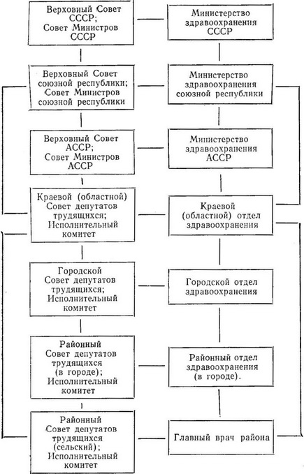 В краях, областях, містах (і міських районах) є відділи охорони здоров'я виконкомів Рад депутатів трудящих краю, області, міста або міського району відповідно, яким підпорядковані ці відділи. Крайові (обласні) відділи охорони здоров'я також підпорядковані міністерству союзної республіки, а міські та районні у містах) - вищестоящому відділу охорони здоров'я.