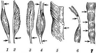Рис. 1. Форма і розташування сухожиль в залежності від форми м'язів (сухожилля вказані стрілками). |