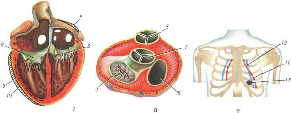Рис. 7 - 9. Зміна серця при звуженні лівого передсердно-шлуночкового отвору. 1 - праве передсердя; 2 - ліве передсердя; 3 - двостулковий клапан; 4 - лівий шлуночок; 5-правий шлуночок; 6 - тристулковий клапан; 7-півмісяцеві заслінки клапана аорти; 8 - півмісяцеві заслінки клапана легеневого стовбура; 9 - межа гіпертрофованого міокарда; 10 - межа розширеної порожнини шлуночка; 11 - проекція меж здорового серця; 12 - проекція меж серця при пороці; 13 - місце найкращого вислуховування шуму.