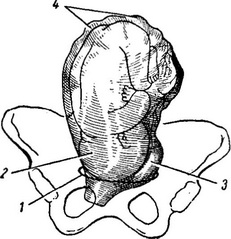 ![]() Рис. 38. «Звуження тазу» з-за наявності в нижньому відділі матки фіброматозного вузла. 1 - вхід таза; 2 - голівка плода; 3 - фиброматозный вузол в нижньому відділі матки; 4 - фіброматозні вузли у верхньому відділі матки. |