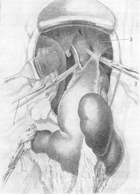 ![]() Рис. 51. Затискачі підведені під передній блукаючий стовбур (1) і під шлунково-діафрагмальної зв'язки (2), видно діафрагма (3).  |