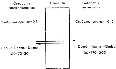 D. J. Birkett, J. J. Grygiel (1981) призводять наочну схему, що ілюструє можливість виникнення більш високої загальної концентрації лікарських засобів в сироватці крові плода при їх трансплацентарном перенесення (рис. 6). Це пов'язано з особливостями взаємодії лікарських засобів з білками сироватки крові вагітної і плода. Лікарські речовини в крові плода зв'язуються з білками сироватки крові вдвічі більше, ніж в організмі матері, що, однак, не супроводжується підвищенням фармакологічного ефекту. Т. Rosen, Н. S. Schimmel (1983) вважають, що ступінь зв'язування лікарських засобів по обидві сторони плацентарного бар'єру, рівень кровотоку в плаценті визначають транспорт лікарських засобів через плаценту в такій же мірі, як і градієнт рН в крові вагітної і плода.