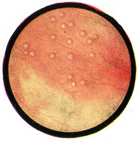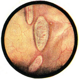 ![]() Рис. 80. Туберкульозні горбки на слизовій сечового міхура. Цистоскопія. |