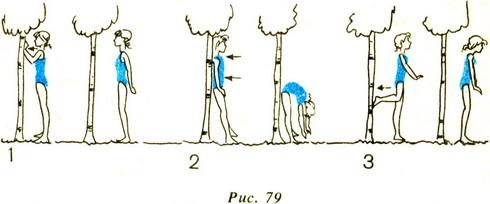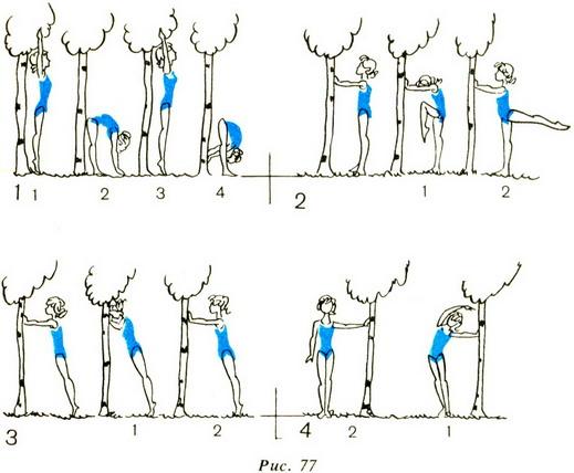 4. І. п. - стоячи лівим боком до дерева, ліва рука відведена в сторону і впирається в дерево, ліва уздовж тулуба. Нахил вліво, пружинящее рух правою рукою над головою, торкнувшись дерева. Повторити 8-10 разів. Те саме, стоячи правим боком до дерева.