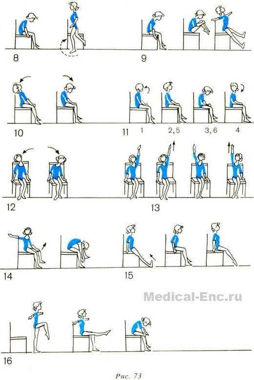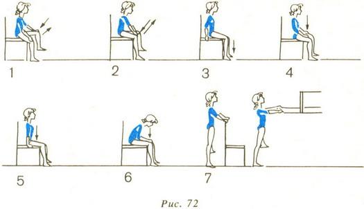 16. І. п. - стоячи спиною до стільця, права нога зігнута перед собою вгору, руки в сторони. Сісти на стілець, витягти праву ногу вперед, розслабитися. Те ж лівою ногою.
