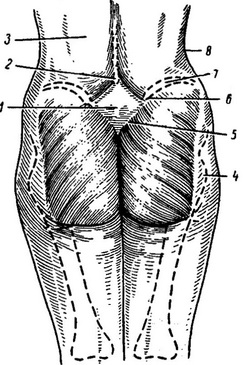 Рис. 19. Область крижів у нормально складеної жінки. 1 - поперековий ромб (Міхаеліса); 2 - остистий відросток 5 поперекового хребця; 3 - валик згиначів спини; 4 - великий рожен; 5 - лінія прикріплення сідничних м'язів; 6 - задній верхній виступ клубової кістки; 7 - гребінь клубової кістки; 8 - талія |