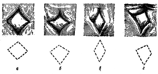 Рис. 20. Різні форми поперекового ромба (Міхаеліса) при деформаціях тазу.