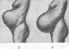 ![]() Рис. 3. Форма живота наприкінці вагітності при значному звуженні таза: 1 - у первородящей (гострий живіт); 2 - у многорожавшей (відвислий живіт).  |