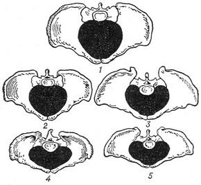![]() Рис. 1. Вхід у таз в нормі і при різних його аномалії: 1 - нормальний таз; 2 - общеравномерносуженний; 3 - простий плоский; 4 - плоско-рахітичний; 5-общесуженний плоский таз. |