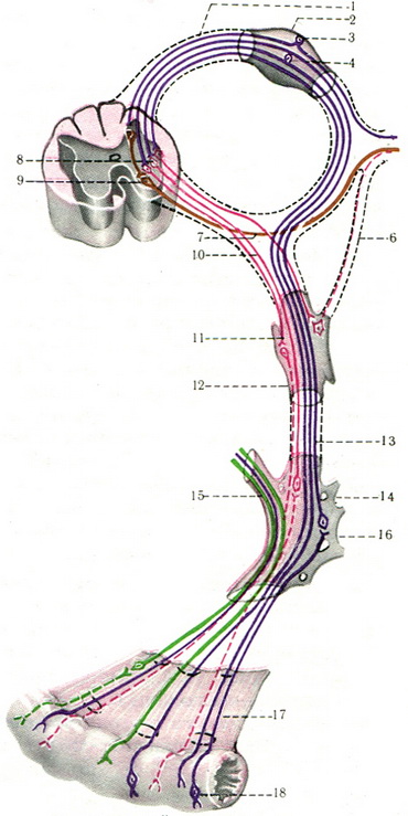 534. Схема вегетативної іннервації внутрішніх органів (за О. П. Мельману). 1 - задній корінець; 2 - спинномозковий вузол; 3 - тіло афферентного анимального нейрона; 4 - тіло афферентного вегетативного нейрона; 5 - спинальний нерв: 6 - сіра сполучна гілка; 7 - передній корінець; 8 - три симпатичні клітини в интермедиальном ядрі; 9 - тіло ефекторних анимального нейрона; 10 - преганглионарные ефекторні симпатичні волокна; 11 - сайті прикордонного симпатичного стовбура; 12 - постгангліонарні ефекторні волокна; 13 - великий черевний нерв; 14 - вузол чревного сплетення; 15 - гілка заднього стовбура блукаючого нерва; 16 - межнейронная зв'язок центрального відростка клітини І типу Догеля; 17 - афферетное волокно, що проходить у складі блукаючого нерва: 18 - клітини II типу Догеля; 19 - аферентні волокно у складі блукаючого нерва. Червоні лінії - симпатичні волокна; зелені - парасимпатичні; сині - аферентні, жирні сині - чутливий афферентний нейрон: чорні - афферентний спинальний нейрон.  |