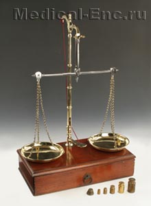 Аптечні ручні ваги з підвісними роговими або пластмасовими чашками декількох розмірів, наприклад для розважування порошків з точністю до 0,01 р. Технохимические ваги з навантаженням до 200 м (рис). Колонка, на яку спирається тригранна призма коромисла ваг, змонтована на дошці з двома гвинтами, що дозволяють за допомогою висячого схилу точно встановити ваги. Точність зважування - до 0,01 р.
