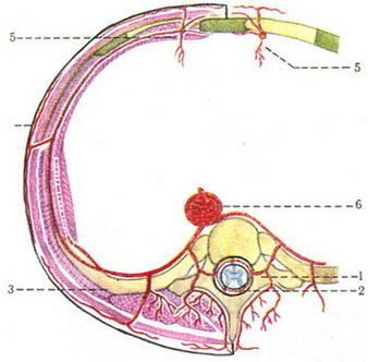 401. Схема будови міжреберних артерій і їх анастомози. 1 - r. dorsalis; 2 - r. spinalis; 3 - a. intercostalis anterior; 4 - r. cutaneus lateralis; 5 - a. thoracica interna; 6 - aorta.  |