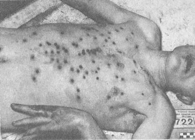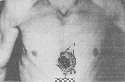 ![]() Рис. 67. Вхідна вогнестрільна рана (рушницю 12-го калібру, дріб № 3, дистанція 0,5 м). Стрілками вказані місця впливу пижів. |