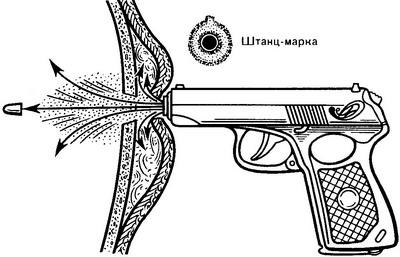 Якщо в момент пострілу дульний зріз стовбура щільно приставлений до тіла, то це прийнято позначати як постріл в упор. В таких умовах предпулевой повітря завдає пошкодження раніше, ніж куля, яка влітає у вже утворену рану. Слідом за кулею в рановий канал і під шкіру вриваються гази і компоненти, супутні пострілу. Вони можуть зумовити розрив шкірної рани, яка зазвичай набуває хрестоподібну форму (рис. 61), і надати руйнівну дію по ходу ранового каналу. У ньому виявляють кіптява пострілу, напівспалені зерна пороху, частинки одягу (якщо зброя була щільно приставлено до частини тіла, покритим одягом). Шкіра в окружності вхідний вогнепальної рани в таких випадках покрита незначною кількістю кіптяви, але по ходу ранового каналу вона виявляється в достатку, особливо якщо патрон був споряджений димним порохом.