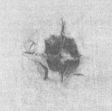 ![]() Рис. 63. Хрестоподібний розрив тканини і характер відкладення кіптяви при пострілі впритул з пістолета калібру 7,65 мм |