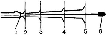 1 - дульний зріз; 2 - предпулевой повітря (3-5 см); 3-гази пострілу (до 10 см); 4 - кіптява (до 40 см); 5 - зерна пороху (до 5 м); 6 - куля.