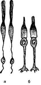 ![]() Рис. 4. Световоспринимающие клітини: a - палички; б - колбочки |