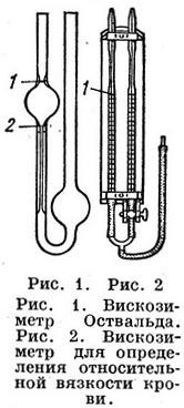 У клінічних лабораторіях визначення відносної в'язкості крові проводять за допомогою спеціального віскозиметра (рис. 2), порівнюючи відстані, на які просуваються за один і той же час у двох капілярних трубках при створенні слабкого вакууму однакові за величиною стовпчики крові та води, що займають аналогічну початкове положення в трубках. Просування рідин припиняють, коли кров досягне позначки i; по мітці, до якої просунеться вода, визначають величину відносної в'язкості крові.