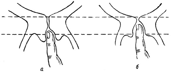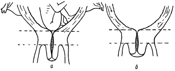 Рис. 25. Шийка матки до кінця сьомого місяця вагітності у родили (а) і у народжували (б) жінки.