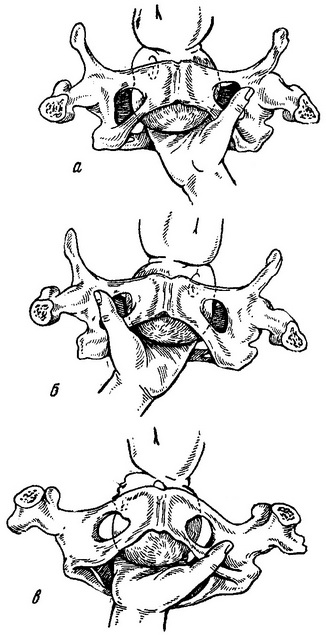 а - стріловидний шов у правому косому розмірі; при накладенні долоні правої руки на вухо плода вона також виявляється у правому косому розмірі; б - стрілоподібний шов у лівому косому розмірі тазу, в такому ж положенні і долоню лівої руки, нахилена на вухо плода; - низьке поперечне стояння стреловидной шва; при накладенні долоні на вухо плода вона виявляється також у поперечному розмірі тазу.