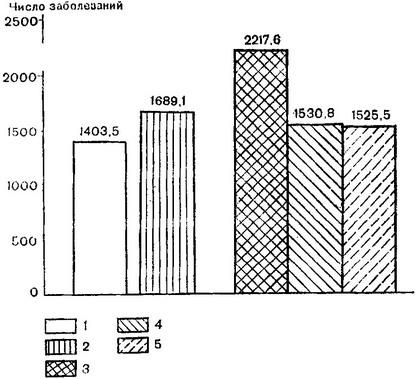 Рис. 4. Загальна захворюваність (вибірка) чоловічого населення і чоловіків, що зловживають алкоголем за 1969-1971 рр. (середньорічні дані на 1000 дорослих чоловіків).