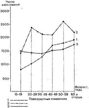 Захворюваність хворих алкоголізмом у всіх вікових групах значно вище захворюваності чоловічого населення Москви; особливо істотні відмінності у вікових групах до 40 років. Захворюваність осіб, які доставлялися в медвитверезники, а також отримували швидку медичну допомогу у стані сп'яніння, у всіх вікових групах значно нижче захворюваності хворих алкоголізмом, за винятком вікової групи 15-19 років, де показники не мають істотних відмінностей. У порівнянні з захворюваністю чоловічого населення Москви захворюваність у віці до 40 років серед п'яниць (контингент медвитверезників та швидкої медичної допомоги) вище, особливо істотні відмінності у вікових групах 15-19 та 20-29 років. Старше 40 років захворюваність, навпаки, вище серед чоловічого населення. Таким чином, до 40 років рівень захворюваності чоловічого населення і п'яниць зближується і відбувається їх перехрест; після 40 років спостерігається підвищення загальної захворюваності у всіх чоловіків, у тому числі у п'яниць, однак рівень її у останніх помітно нижче.