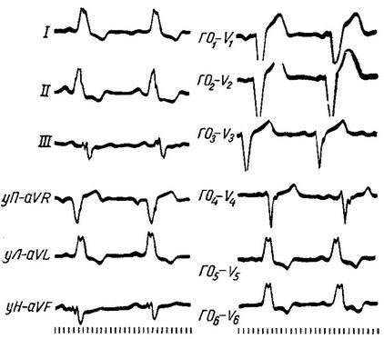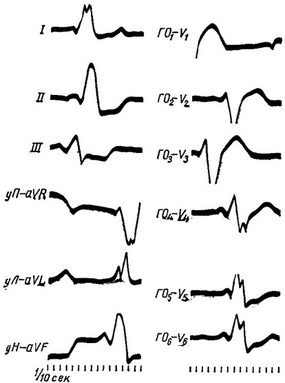 Рис. 29. Блокада лівої ніжки пучка Гіса. ЕКГ в стандартних, грудних і однополюсних відведеннях від кінцівок. Час виникнення внутрішнього відхилення в лівих позиціях грудних відведень одно 0,0 7 секунди.