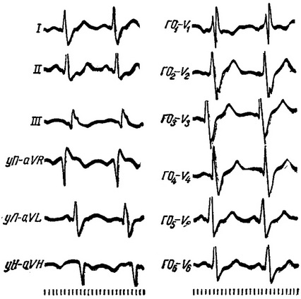 Рис. 30. Блокада правої ніжки пучка Гіса. ЕКГ в стандартних, грудних і однополюсних відведеннях від кінцівок. Час внутрішнього відхилення в правих позиціях грудних відведень одно 0,0 7 секунди.