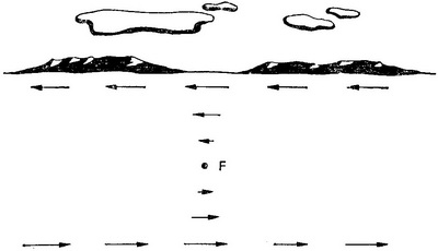 Рис. 4.6. Вплив віддаленості точки фіксації на величину паралакса руху. Об'єкти ближче, ніж точка фіксації (А), рухаються в напрямку, протилежному напрямку руху спостерігачі (кап і на рис. 4.5, коли точка фіксації розташована на лінії горизонту). Об'єкти, що знаходяться далі від точки фіксації, зміщуються в тому ж самому напрямку (З: J. J. Gibson, The Perception of the Visual World, Houghton Mifflin, 1950).