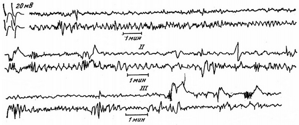 I - до електростимуляції; II, III - після електростимуляції. Верхня крива в кожному малюнку - лівий ріг матки, нижня крива - правий ріг матки. Перед початком реєстрації - калібрувальний імпульс в 20 мВ.
