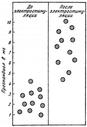 У 22 жінок проводилося дослідження кількості прегнандіолу до початку лікування та після 3-го сеансу електростимуляції шийки матки. При цьому виявилося, що у всіх хворих, у яких був отриманий хороший клінічний ефект, він поєднувався зі значним підйомом екскреції прегнандіолу, що досягав 5-7-кратного збільшення порівняно з вихідним рівнем (рис. 34).