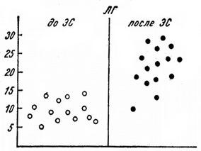 Рис. 35. Кількість ЛГ до і після електростимуляції шийки матки (в інтерн, од.).