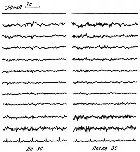 Досліджено також дифузне вплив електростимуляції шийки матки на головний мозок. При цьому знайдено, що зазначена процедура призводить до появи більш правильної ритміки біопотенціалів, зменшення післядії реакцій. Одночасне вивчення ЕКГ показав розвиток після процедури регулярного чергування в часі циклів RR (рис. 36); шкірно-гальванічна реакція показувала менш виражену лабільність, велику стійкість.