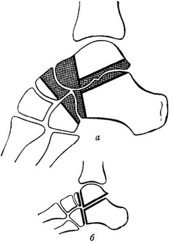 Рис. 82. Трехсуставная резекція стопи, а - межі резекції; б - вигляд стопи після резекції.