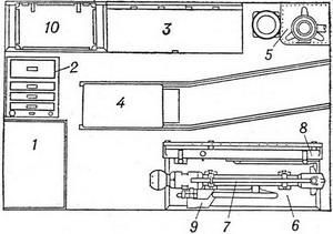 ![]() Рис. 2. Розміщення обладнання в кузові авторентгена (вигляд зверху): 1 - фотолабораторный стіл; 2 - танки для обробки рентгенограм; 3 - ящик для намету; 4 - електростанція; 5 - піч; 6 - ящик для господарського майна; 7 - колона рентгенівського апарату; 8 - опорна стінка (стільниця рентгенівського апарату); 9 - консоль; 10 - ящик з блок-трансформатором. |