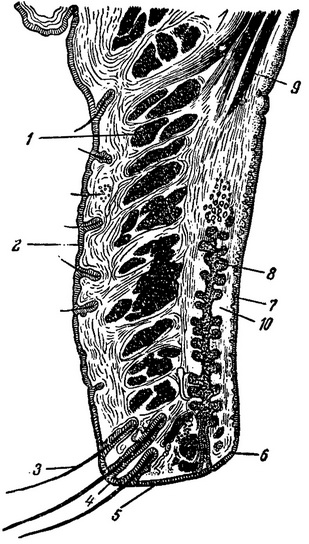1 - круговий м'яз; 2 - шкіра повік; 3 - вії; 4 - переднє ребро століття; 5 - міжреберна (интермаргинальное) простір; 6 - заднє ребро століття; 7 - слизова оболонка (кон'юнктива) століття; 8 - мейбомиева залоза; 9 - м'яз, що піднімає верхню повіку; 10 - хрящ століття.