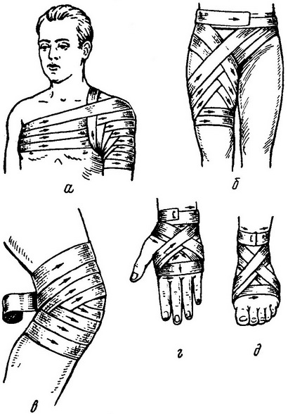 Рис. 10. Види пов'язок при пораненні різних частин кінцівки. а - при пораненні плечового суглоба; 6 - при пораненні верхньої третини стегна і тазостегнового суглоба; в - при пораненні колінного суглоба; г - при пораненні кисті; д - при пораненні стопи.